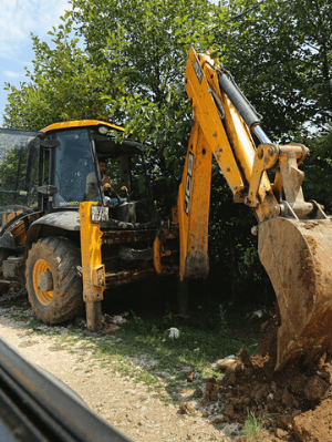 ექსკავატორის მეშვეობით სოფლიდან ნაკვეთზე ტრანშეა გავიყვანეთ (ისეთი სირთულეები არ აგვცდა როგორიცაა მილების ასფალტქვეშ გაყვანა და მდინარის გადაკვეთა). აღმართის მონაკვეთზე ტრანშეასთან სატრანსპორტო წვდომა არ გვქონდა, ამიტომ ხელით მუშაობა მოგვიწია – 400 მეტრი +40 გრადუს სიცხეში.