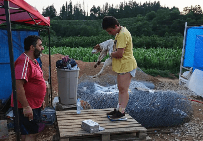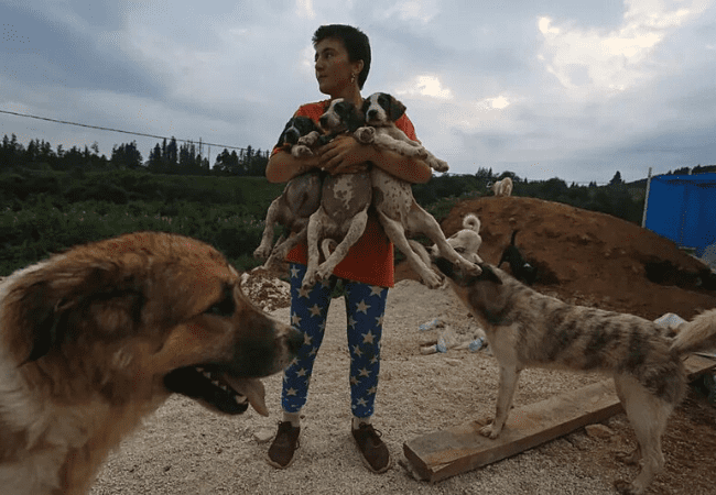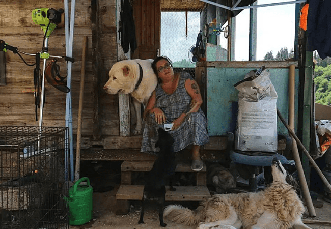 ლენა და ძაღლები სახლთან, რომელიც შენდება Dog’s Ambulance თავშესაფრის ტერიტორიაზე.